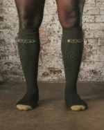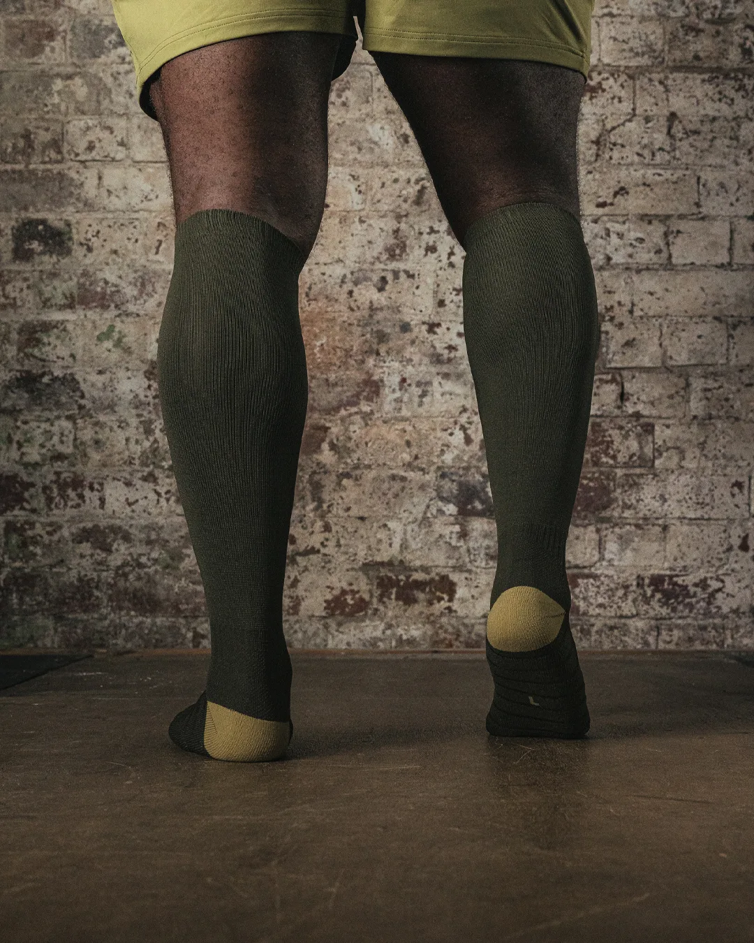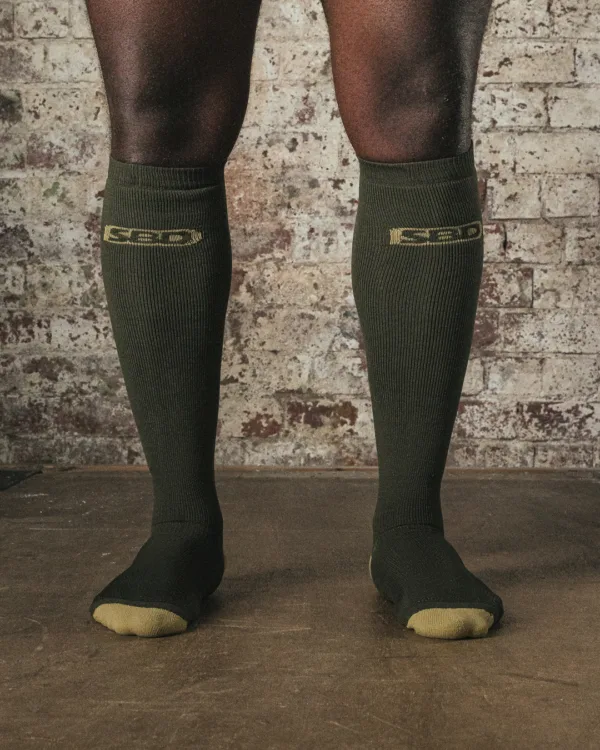 ถุงเท้าทรงยาวพรีเมียม ออกแบบมาเพื่อปกป้องหน้าแข้งระหว่างการดึงน้ำหนัก (pulling movements) โดยออกแบบให้ความยาวพอดีหน้าแข้ง ไม่ต้องพับปลายถุงเท้า เนื้อผ้าทอแน่นช่วยลดแรงเสียดทานจากบาร์ และแผ่นหน้าทอหนาแบบ double-knitted front panel ช่วยป้องกันหน้าแข้งจากการถลอกหรือกระแทกขณะฝึก